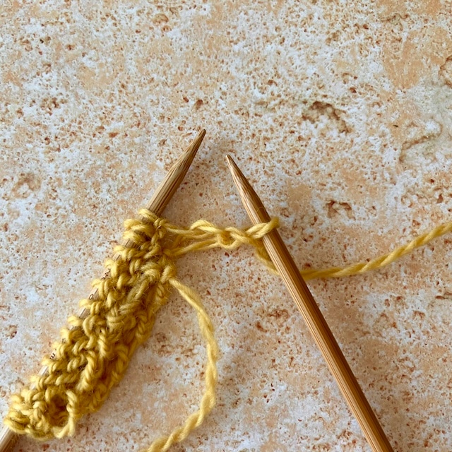 左針に巻きついている糸の右端に表目を編むように右針を差し入れます。